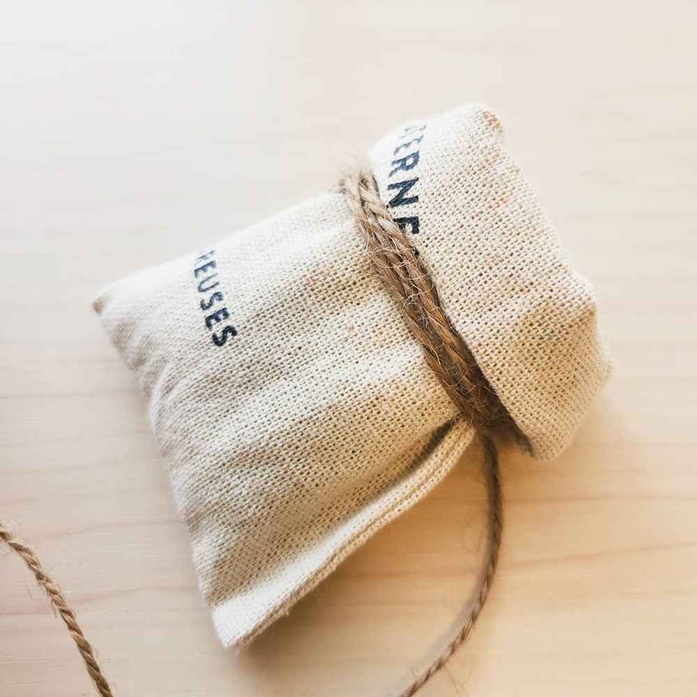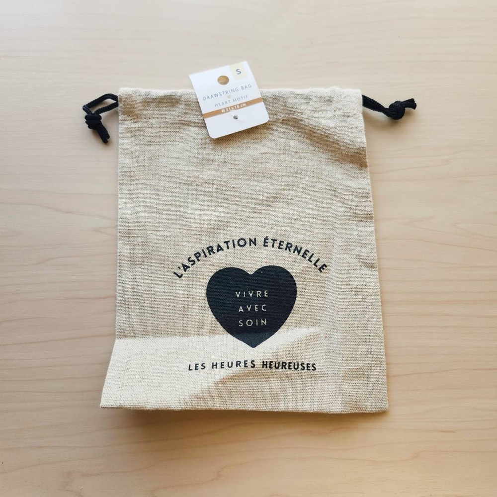 はじめは巾着の裏面の無地の部分を表として使おうと思ったのですが、プリント部分が思ったよりもきれいに出たのでプリントがある方を表にしました。袋を折り返した部分にグルーガンを使って麻紐を巻いてアクセントに。