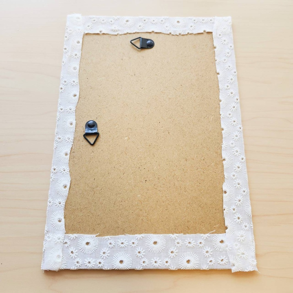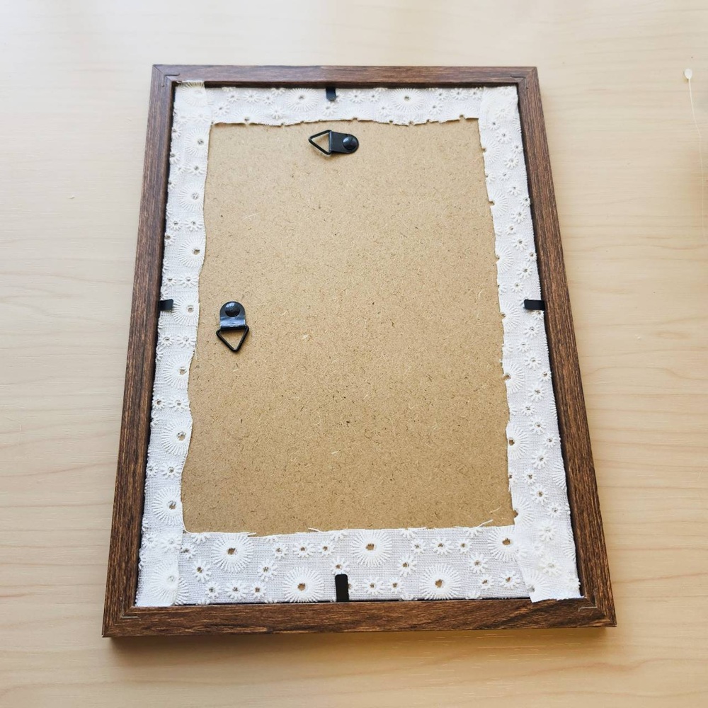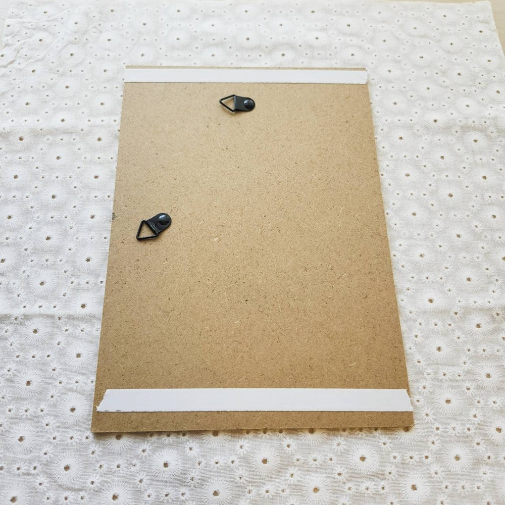 フォトフレームはアクリル部分を外して、フレームを外した状態にし、背景になる端切れを貼り付けます。