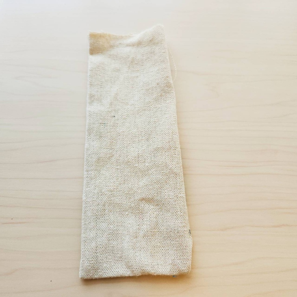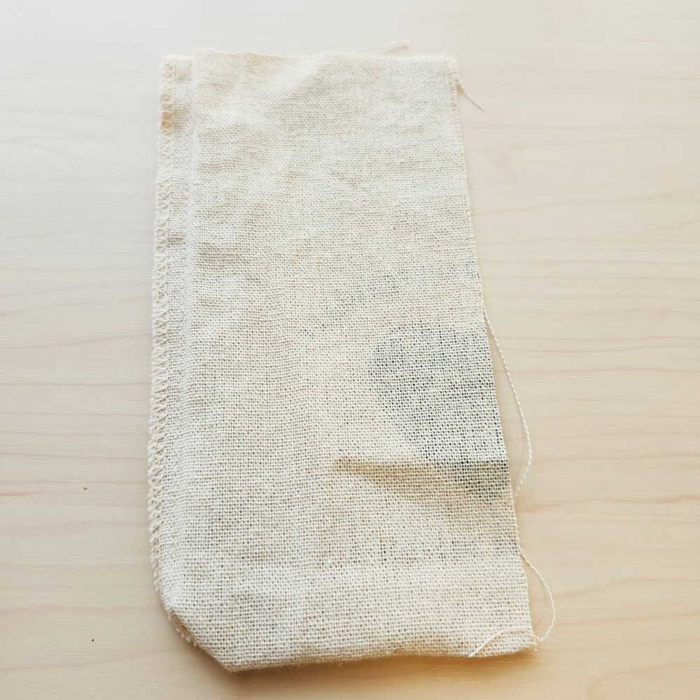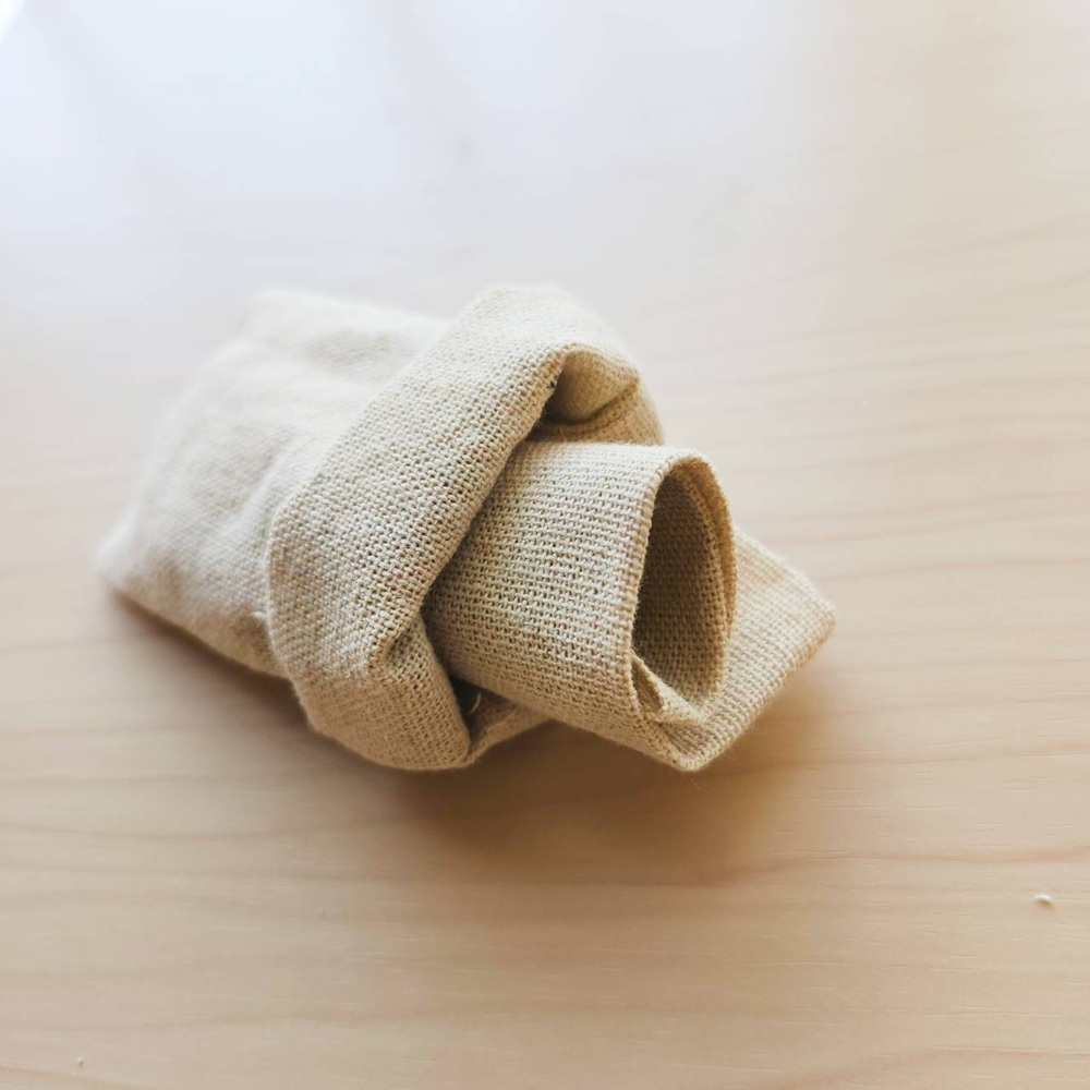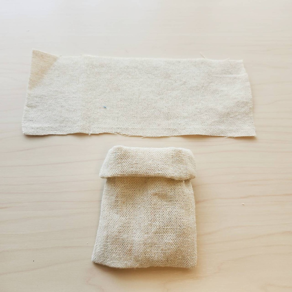 袋にふっくらとした厚みを持たせたいので、カットした巾着の余りを袋のサイズにカットし、折りたたんで中に入れ込みます。