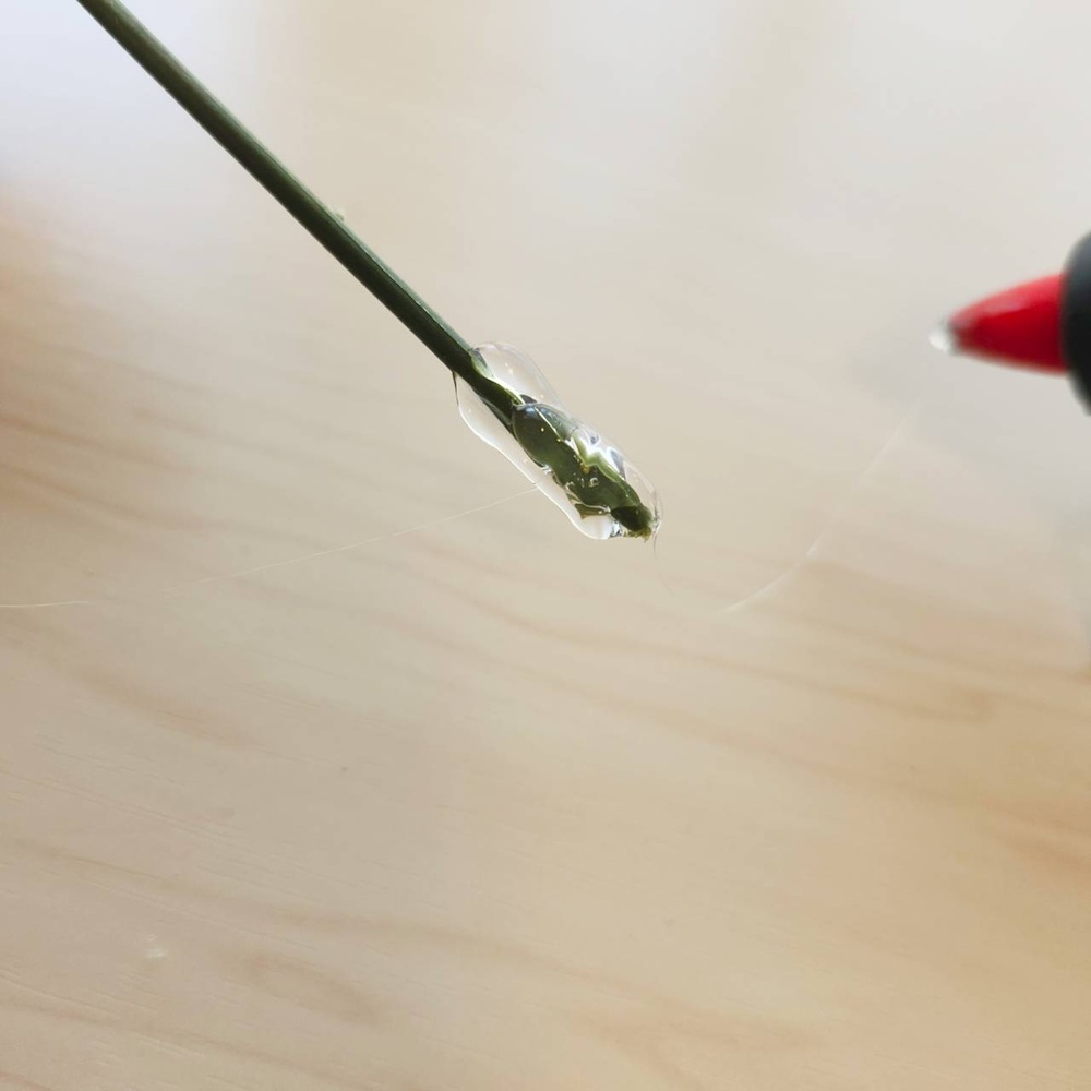 造花の根本の部分にグルーをつけて中に入れ込んだ巾着の余り布に接着しましょう。