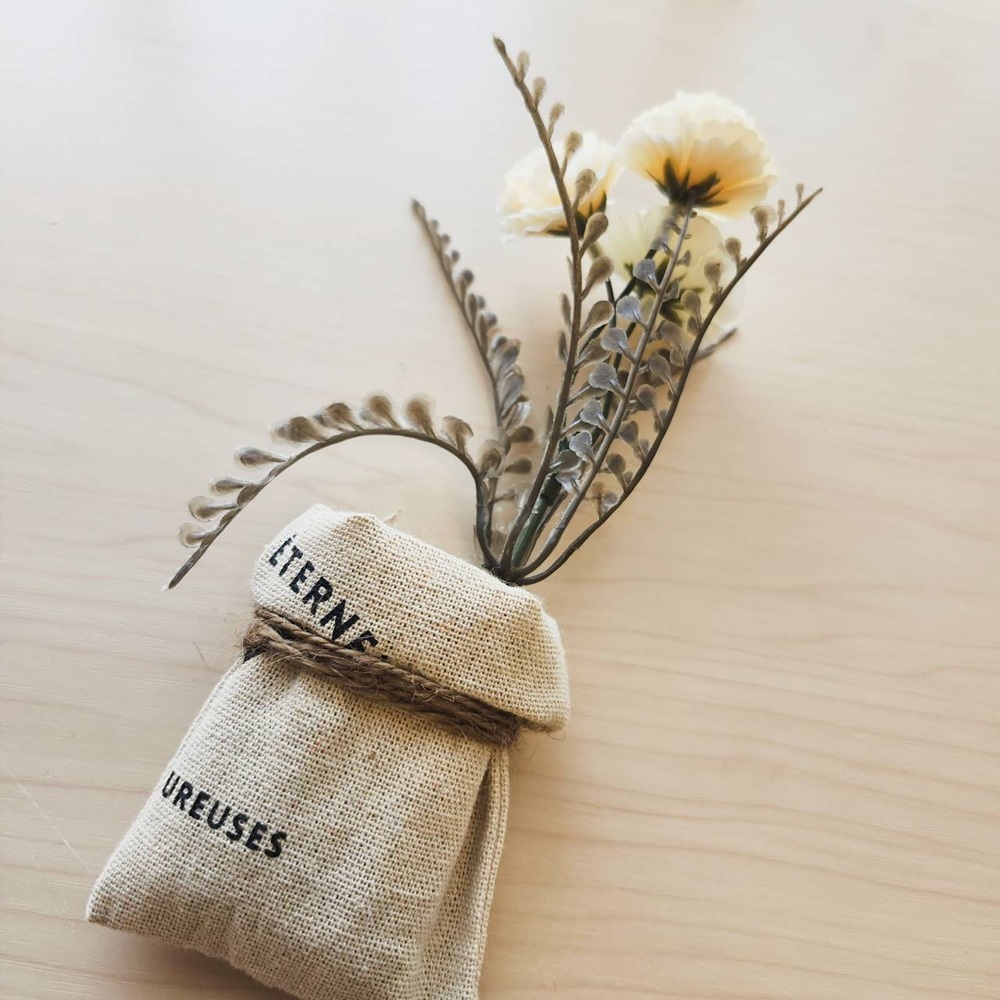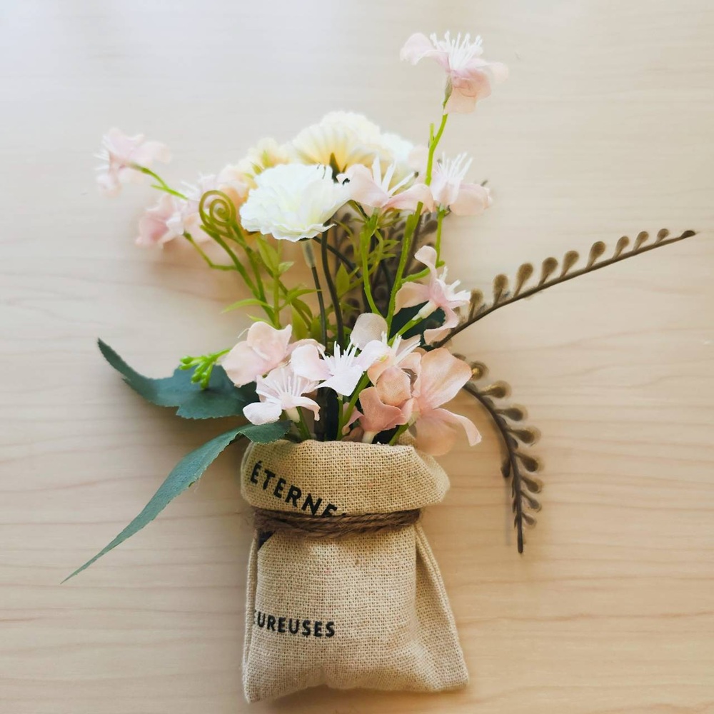 造花をセットするフラワーベースにはジュート風の巾着を使います。