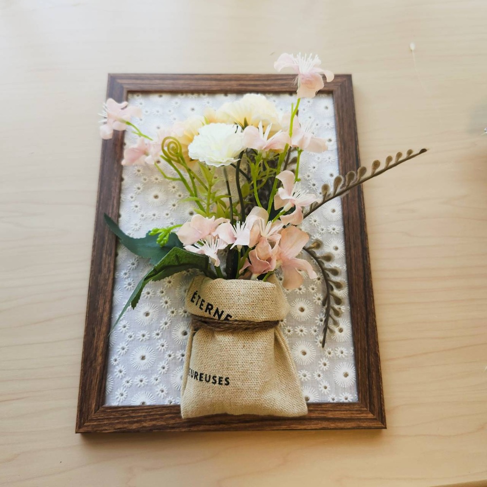 一言にフラワーフレームといっても、置き型や壁掛けなどタイプは様々。中でも手軽に作ることが出来る壁掛けOKのフォトフレームをベースに、自宅で余らせていた素材も使用します。