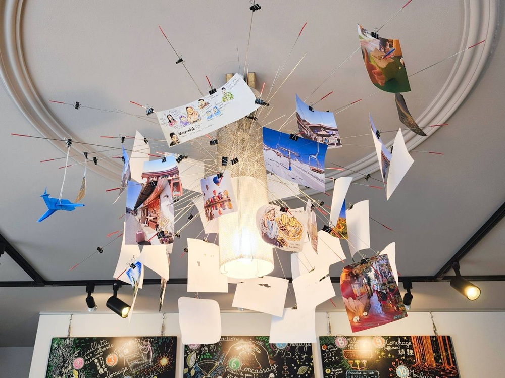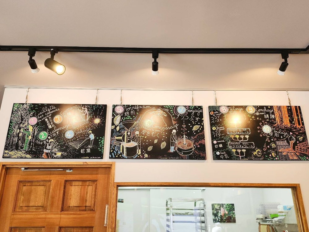 壁にかけられたカカオがチョコレートになるまでを描いたアートボードが印象的で、照明もアートになっています。