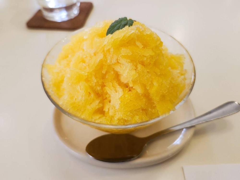 取材前、一休みとしていただいた本日のかき氷。この日は三ケ日みかんジュースを使ったかき氷があったのでそちらを注文。珈琲店なのだから珈琲を頼むべきだったのですが、東京の夏は今年も酷暑。かき氷の誘惑には抗えませんでした。