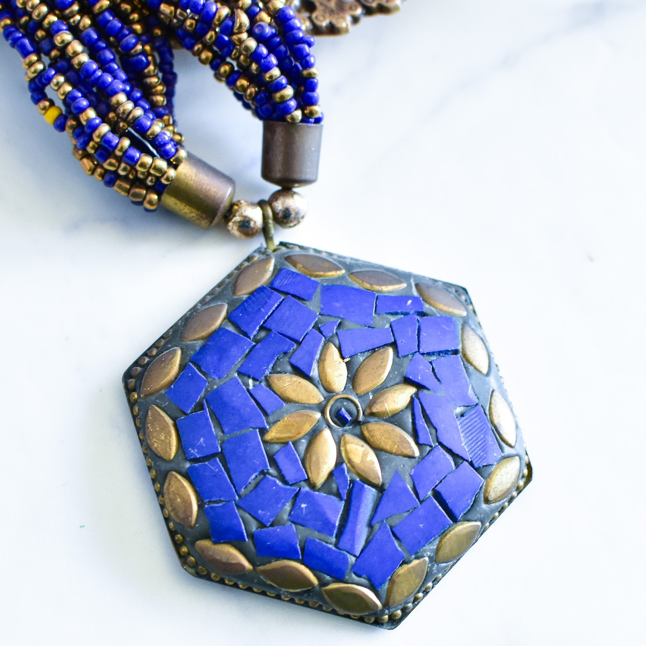 ブルーとゴールドのビーズはガラス製のシードビーズです。手作業で繋ぎ上げペンダントに仕上げています。ペンダントの金具は、開閉がしやすいフック製。