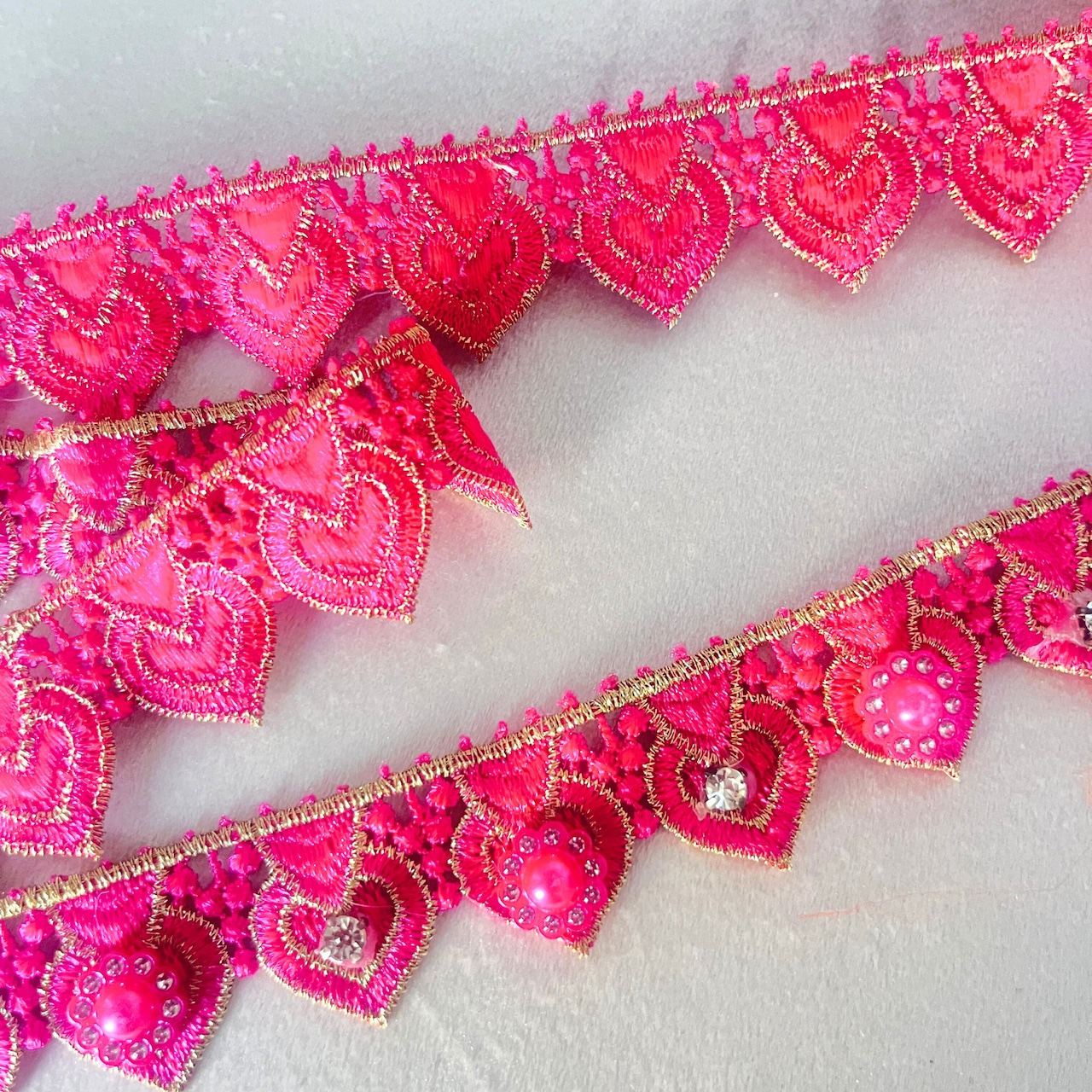 ハート型の刺繍に、ビジューやパール風パーツが丁寧にあしらわれた、キュートで存在感たっぷりの装飾リボンです。鮮やかなショッキングピンクにゴールドの刺繍が映え、1本使うだけで作品が一気に華やぎます。